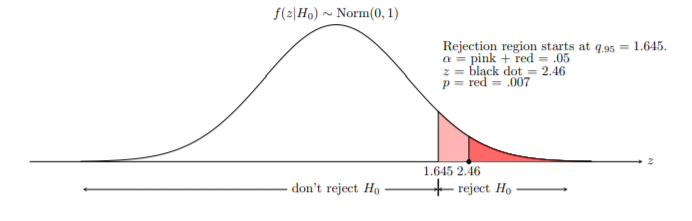 이 계산이 가능한 이유는 $Z \sim {N(0, 1)}$이기 때문입니다. 그러므로 표준 정규분포표를 참조하면 쉽게 값을 얻을 수 있습니다. 이때, $p = 0.007 < 0.05 = \alpha$이므로 귀무가설을 기각하고 대립가설을 선택합니다. 즉 $\mu > 0$인 가설을 선택한 것이라고 볼 수 있습니다. 이를 그림으로 그리면 아래와 같습니다.