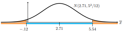바로 이전의 예제의 피벗팅 성질을 이용해서 재밌는 결과를 얻을 수 있습니다. $\bar{x}$가 [2.71 - $\frac{1.96 \cdot 5}{\sqrt{12}}$, 2.71 + $\frac{1.96 \cdot 5}{\sqrt{12}}$] 구간에 있다면 기각하지 않는 것입니다. 왜냐하면 유의 수준에 따른 비기각 영역에 해당하기 때문이죠. 이를 피벗팅 성질을 이용하면 2.71이 [$\bar{x}$ - $\frac{1.96 \cdot 5}{\sqrt{12}}$, $\bar{x}$ + $\frac{1.96 \cdot 5}{\sqrt{12}}$]에 속하면 기각하지 않는 것입니다. 이때, 뽑힌 데이터에 따라서 생성되는 구간이 달라질 것입니다.