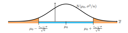 위 예제를 일반화하면 데이터가 $n$개고 각 데이터가 $N(\mu, \sigma^{2})$을 따른다고 가정하면 비기각 영역은 [$\bar{x}$-$\frac{z_{\alpha/2} \cdot \sigma}{\sqrt{n}}$, $\bar{x}$+$\frac{z_{\alpha/2} \cdot \sigma}{\sqrt{n}}$]입니다. 또한 기각 영역은 비기각 영역의 여집합이 되겠죠. 이를 그림으로 그리면 아래와 같습니다.