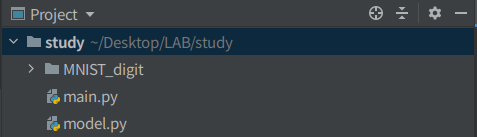 지난 포스팅에서 CNN 모델을 이용해서 99%의 분류 성능을 달성하였다. 원하는 목표를 달성하였으니 좀 더 코드를 정리하고 내 나름대로 이쁘게 정리해보도록 하자. 일단 사진과 같이 코드 파일을 신경망을 구성하는 model.py와 학습을 하는 main.py을 나누자.